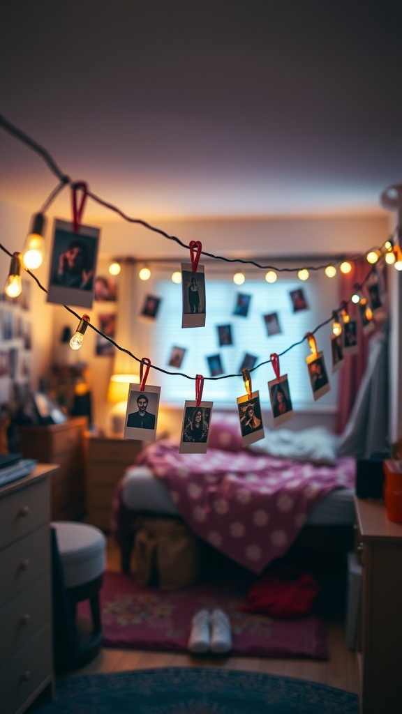 In the image, you can see a string of lights hanging across the room, with photos clipped on. This setup not only showcases memories but also serves as a unique piece of decor. It’s a fun way to display your favorite moments with friends and family.