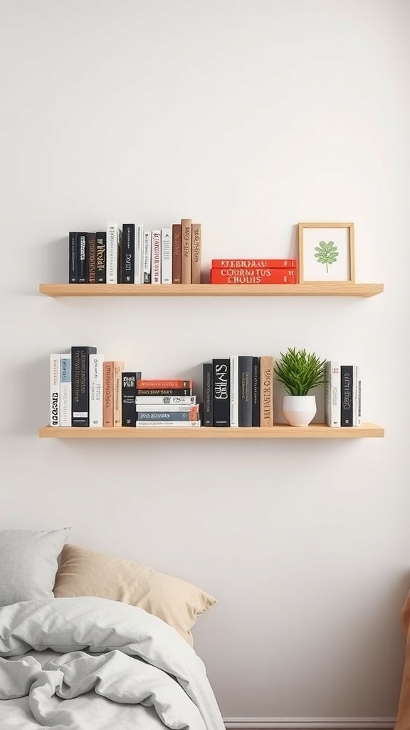 Minimalist shelving can transform your dorm room into a stylish and organized space. The image showcases two simple wooden shelves mounted on a clean wall. They hold a mix of books and a small plant, adding a touch of life to the decor.