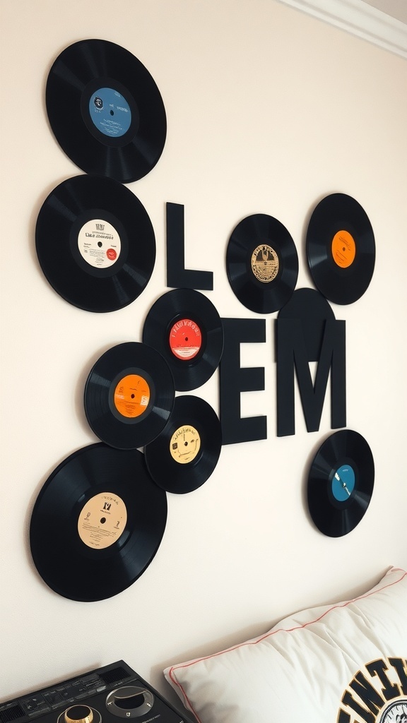 Using vinyl records as decor is not just stylish; it’s also a way to express your musical taste. You can choose records that resonate with you or represent your favorite artists. The arrangement spells out ‘LOOM’ in bold letters, which adds a playful element to the design.