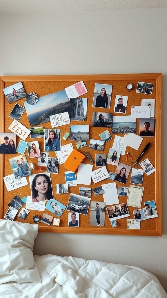 A photo collage board is a fun and creative way to personalize your dorm room. It allows you to display your favorite memories, inspirations, and reminders all in one place. This particular collage showcases a mix of photographs, notes, and mementos, creating a vibrant visual story.