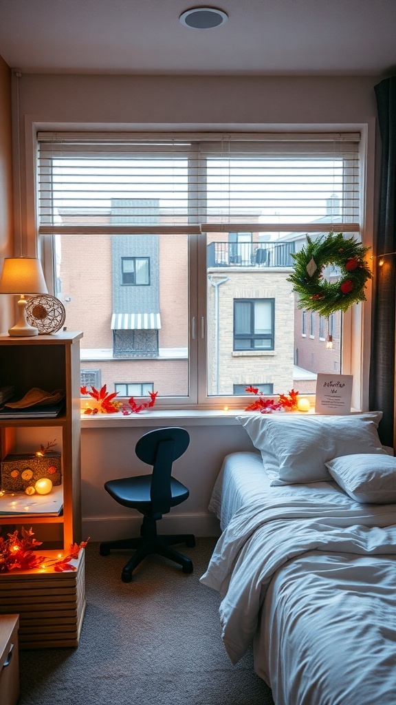 Seasonal decor can really bring a dorm room to life. The image shows a cozy setup that perfectly captures the essence of a warm, inviting space. The window is adorned with a festive wreath, hinting at the joy of the season.