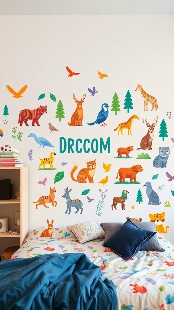 Colorful wall decals can bring a lively touch to any dorm room. The image shows a playful arrangement of animal decals on a white wall, creating a cheerful atmosphere. These decals feature various animals like foxes, bears, and birds, surrounded by trees and plants, making the space feel vibrant and inviting.