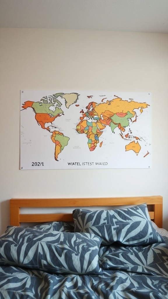 Map wall art is a fantastic way to bring a sense of exploration into your dorm room. The image shows a colorful world map hanging above a cozy bed, creating a vibrant focal point. This type of decor not only adds color but also sparks curiosity about different places around the globe.