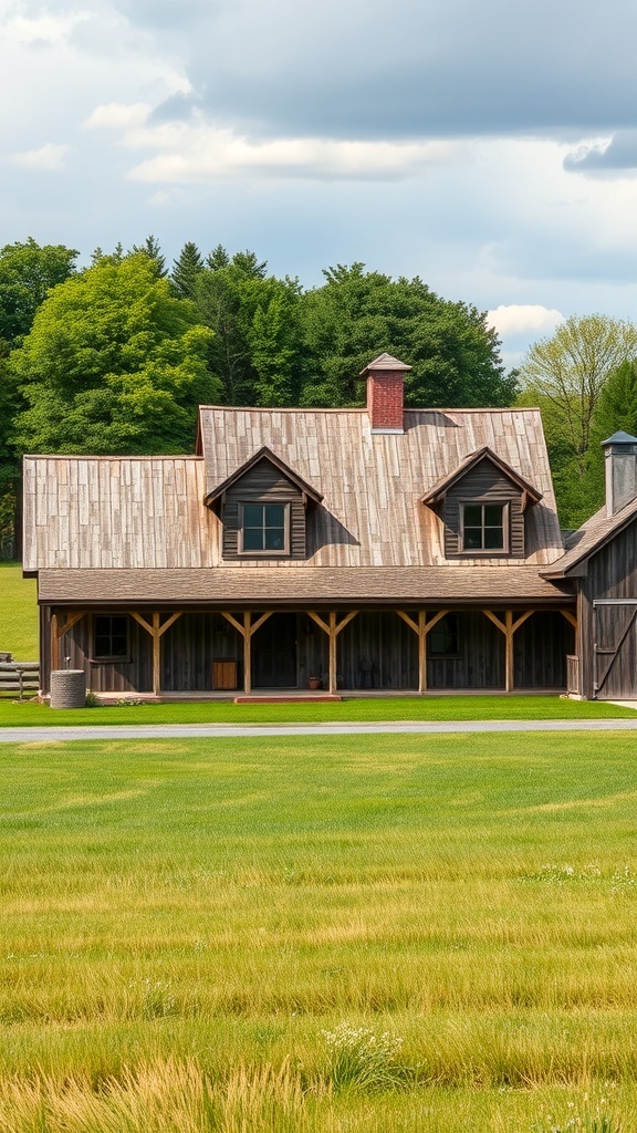 The wooden shingles on the roof complement the rustic style. The dark wood of the house contrasts nicely with the green grass and trees in the background. This creates a warm and inviting atmosphere. The dormers are designed in a simple yet effective way, making them a perfect fit for a farmhouse.