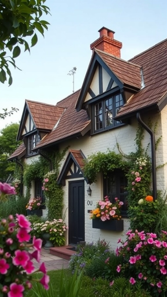Surrounding the cottage are vibrant flowers and lush greenery. This adds to the enchanting feel, making the home look like something out of a storybook. The flower boxes beneath the windows are a delightful touch, providing pops of color and a welcoming vibe.