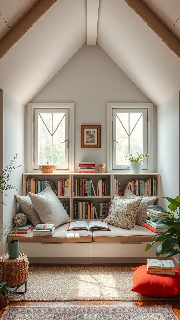 Creating a cozy reading nook under dormers is a fantastic way to make the most of your space. This area can become a personal retreat, perfect for curling up with a good book. The image shows a lovely nook with two windows that let in plenty of natural light, making it an inviting spot.