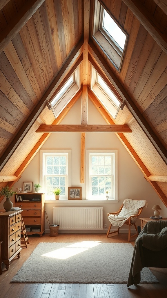 Dormer windows with skylights can transform any attic space into a bright and inviting area. This image showcases a cozy room featuring a beautiful wooden ceiling and multiple skylights that allow natural light to flood the space.