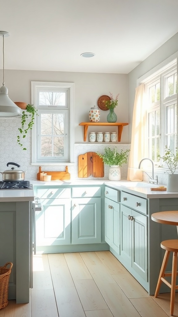 The kitchen in this image perfectly captures the essence of a French cottage style with its bright and airy color palette. Soft shades of mint green on the cabinets create a refreshing vibe, inviting warmth and comfort into the space.