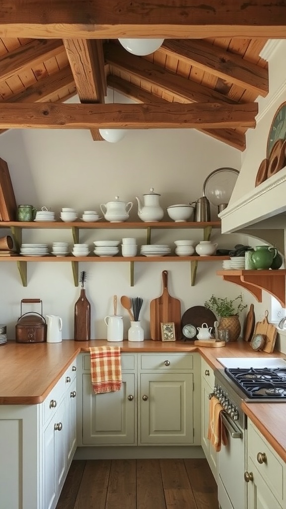 The charm of a French cottage kitchen shines through with rustic wooden beams and open shelves. These elements create a warm and inviting atmosphere, perfect for cooking and gathering with loved ones.