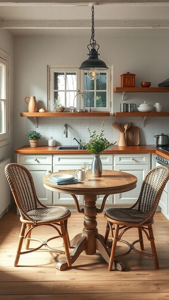 The two wicker chairs add a touch of rustic charm, making the space feel inviting. A simple vase with fresh flowers sits at the center of the table, bringing a bit of nature indoors. Nearby, the open shelves display kitchen essentials, adding both functionality and style.