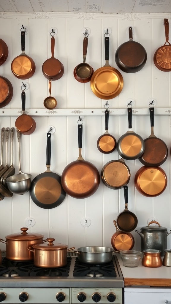 The warm tones of the copper create a cozy feel, inviting anyone to step in and start cooking. Each piece tells a story, reflecting the love for cooking and the history behind these items. The shiny surfaces catch the light, making the kitchen feel bright and welcoming.