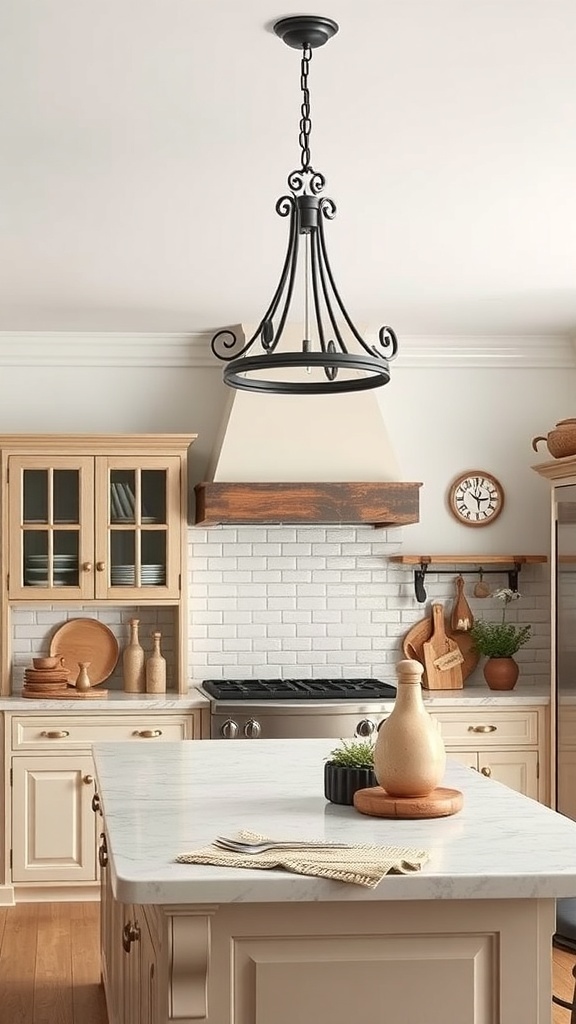 In a French cottage kitchen, lighting plays a key role in setting the mood. The image showcases a stunning chandelier that combines elegance with rustic charm. Its black metal frame and intricate design add character to the space, making it a focal point.