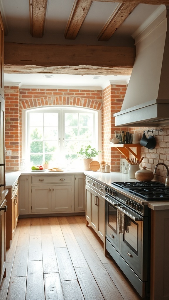 With a mix of modern appliances and classic cabinetry, this kitchen strikes a balance between contemporary and rustic styles. The soft color palette of the cabinets works harmoniously with the brick, creating a cohesive look. It’s a perfect example of how to incorporate warm brick accents into a French cottage kitchen.