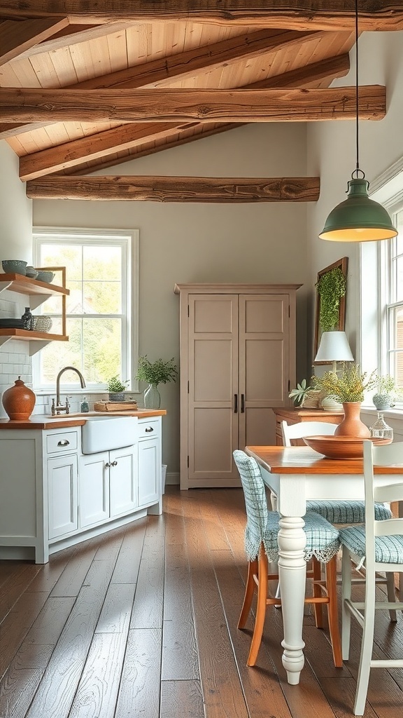 This design encourages a casual, friendly environment. It’s a space where you can whip up a meal while chatting with friends or family. The combination of rustic beams and open shelving truly captures the essence of a French cottage kitchen.