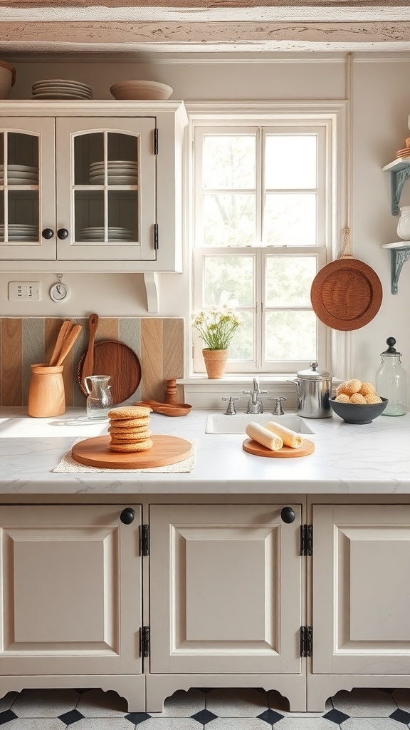 The cabinetry features a soft, neutral color, complementing the rustic charm of the kitchen. Glass-fronted cabinets showcase elegant dishware, while wooden utensils hang nearby, ready for use. This setup not only looks beautiful but also encourages creativity in baking.