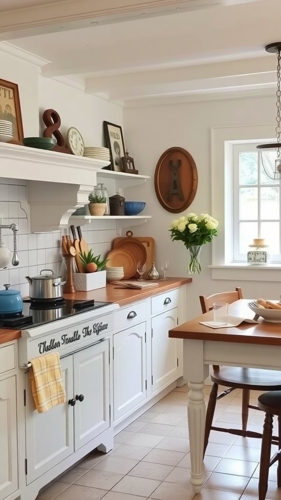 In a French cottage kitchen, family heirlooms add warmth and character. This image showcases a cozy space filled with personal touches that tell a story. The wooden shelves hold cherished items, like vintage plates and decorative bowls, creating a sense of nostalgia.