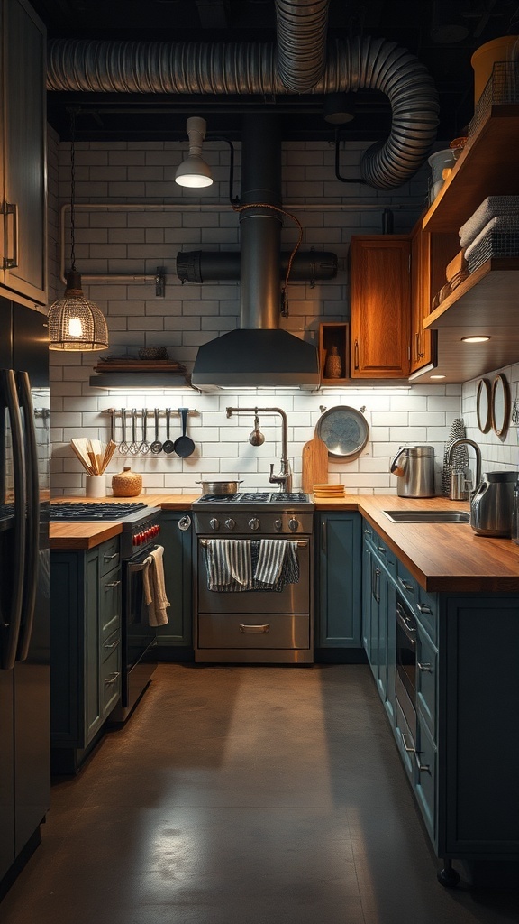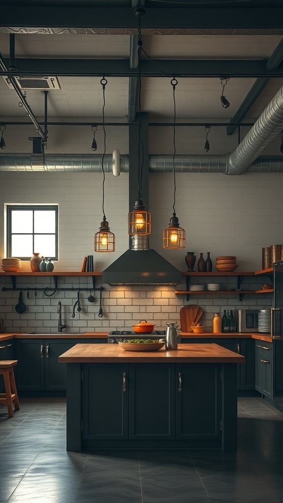 Lighting plays a key role here too. The pendant lights hanging from the ceiling add a touch of elegance while keeping the industrial feel intact. This balance makes the kitchen not just a cooking space, but a place where people want to gather.