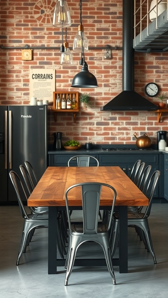 Exposed brick walls add character and a rustic touch to the space. They create a cozy atmosphere while maintaining an urban feel. The lighting fixtures hang low, casting a warm glow over the table, making it inviting for meals and conversations.
