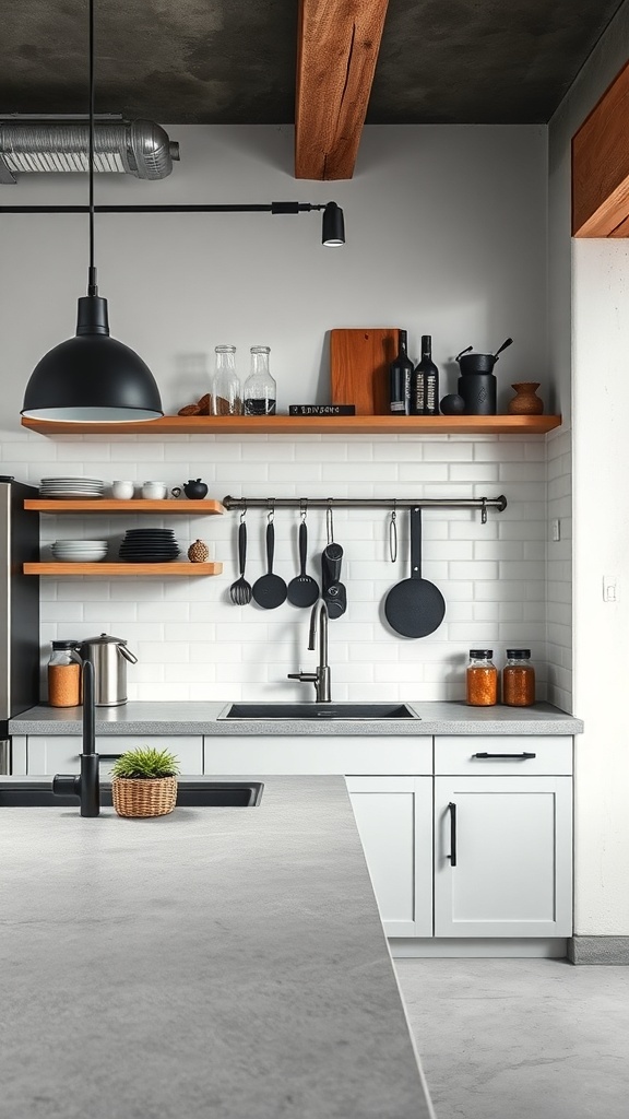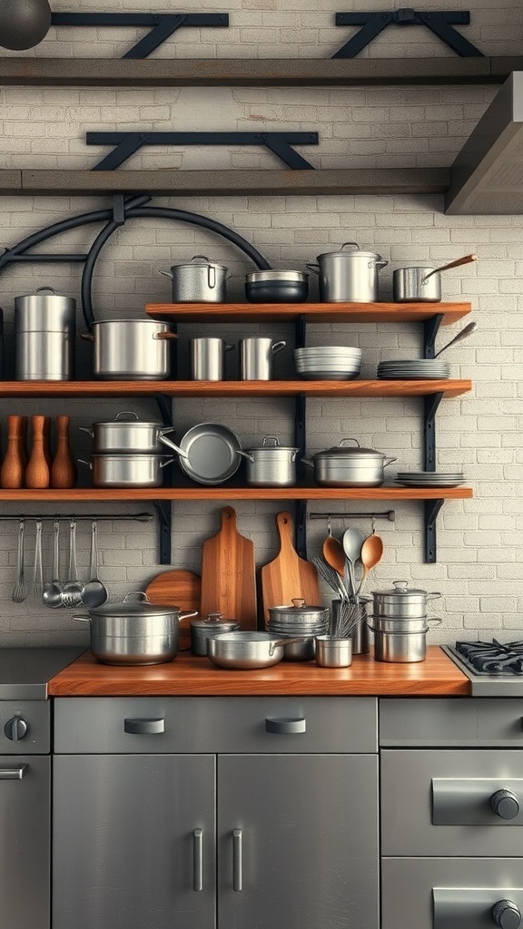 Open shelving is a fantastic choice for any industrial kitchen. It not only looks stylish but also offers easy access to your cooking essentials. In the image, you can see how the shelves are neatly arranged with various pots, pans, and utensils. This setup makes it simple to grab what you need while cooking.