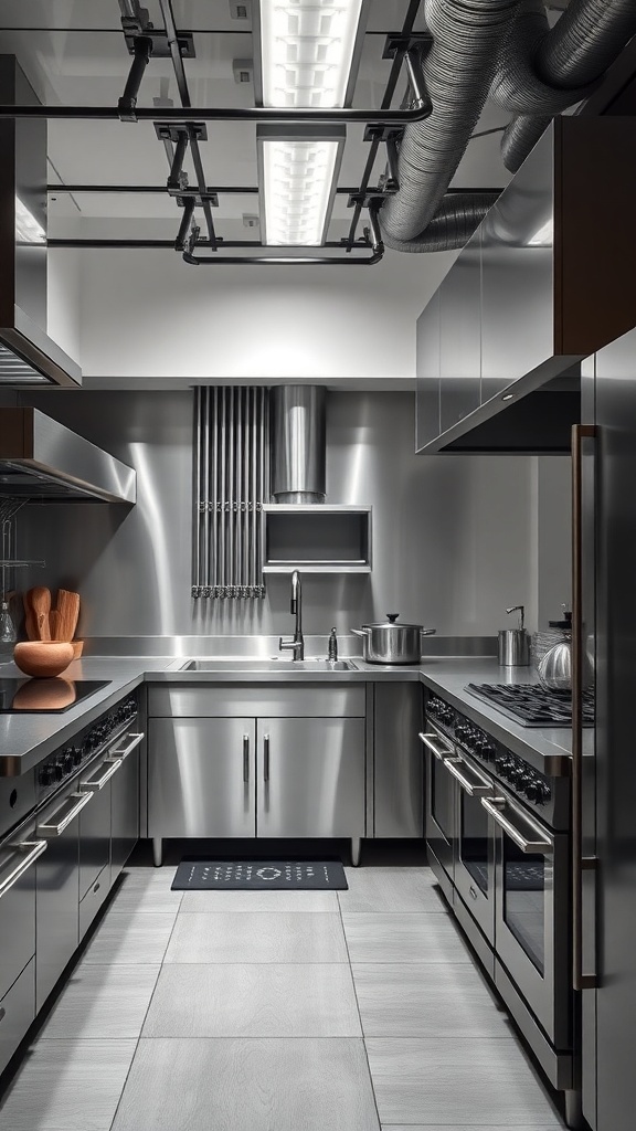 Stainless steel appliances are a staple in modern industrial kitchens. They offer a sleek, professional look that fits perfectly in any cooking space. The image showcases a kitchen filled with shiny stainless steel surfaces, creating a clean and organized environment.