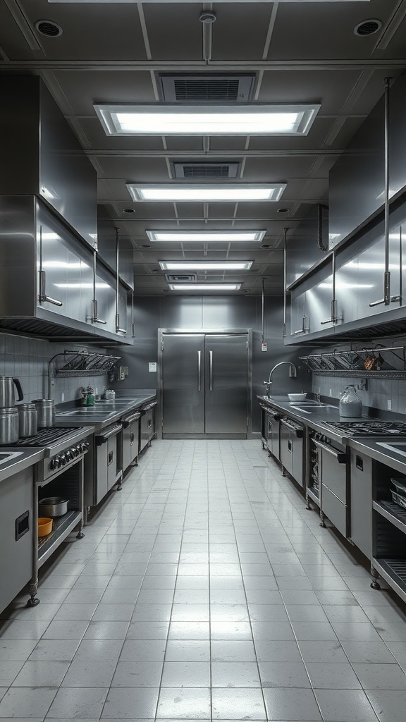 The open design allows for smooth movement between different stations. This setup minimizes the risk of accidents and ensures that tasks can be completed without unnecessary delays. The bright lighting above adds to the functionality, illuminating every corner of the kitchen.
