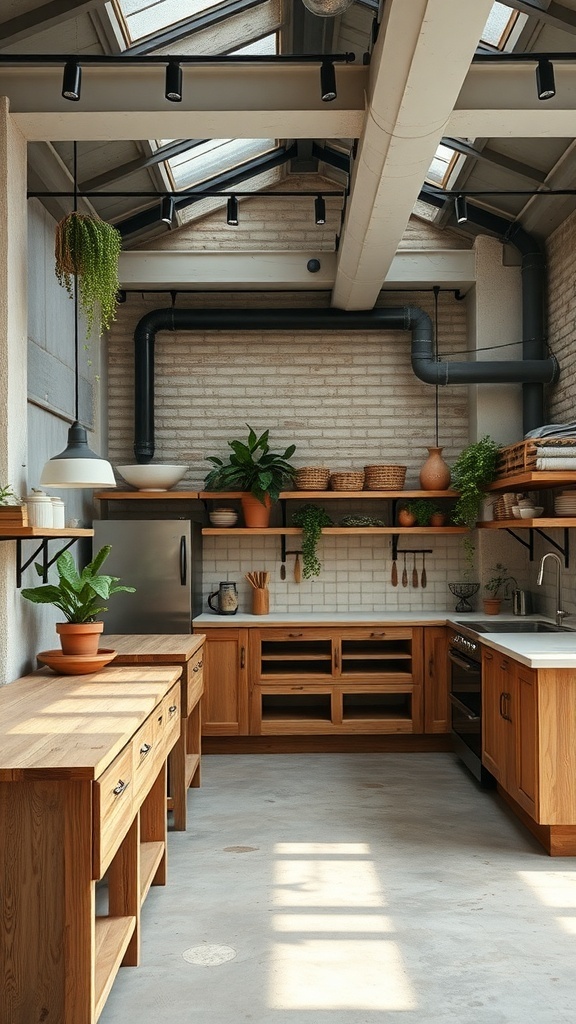 When designing an industrial kitchen, choosing sustainable materials is key. The image showcases a beautiful kitchen that embraces eco-friendly choices. The warm wooden cabinetry and countertops not only add charm but are often sourced from responsibly managed forests.