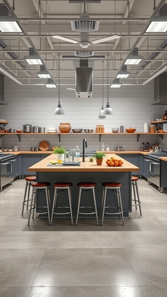 A large kitchen island can be a game changer in any industrial kitchen. It serves as a central hub for cooking, prepping, and even socializing. The image showcases a spacious island with a warm wooden top, surrounded by sleek metal stools. This setup invites family and friends to gather, making cooking a shared experience.