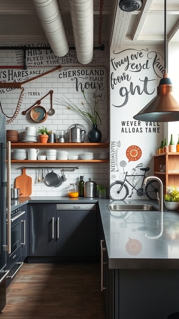 Wall murals can transform an ordinary kitchen into a lively space. This image showcases a kitchen with a striking mural that adds character and charm. The playful designs and handwritten text create a warm and inviting atmosphere.