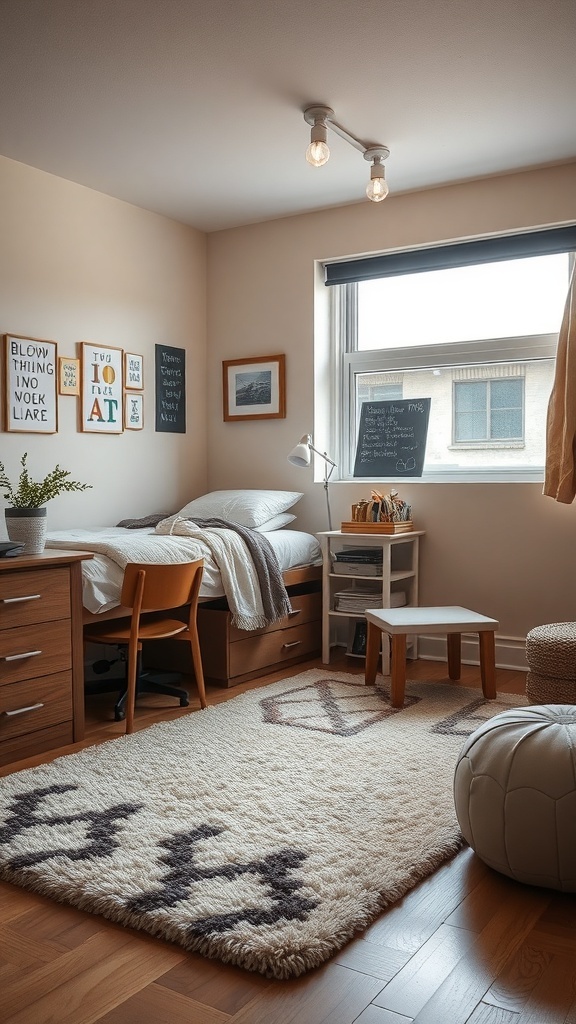 Incorporating a cozy rug and a pouf adds a touch of comfort, making the space feel more homey. This setup is ideal for students who want a stylish yet practical living environment.