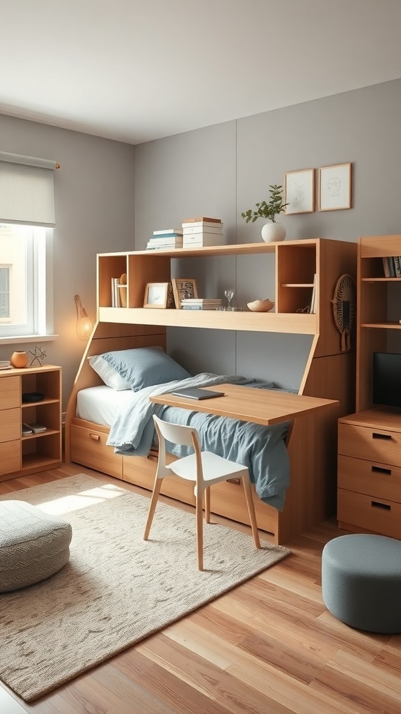 The wooden furniture adds warmth to the room, while the light color palette keeps it fresh and inviting. Notice how the desk is positioned to take advantage of natural light from the window, making it a perfect spot for studying or relaxing.