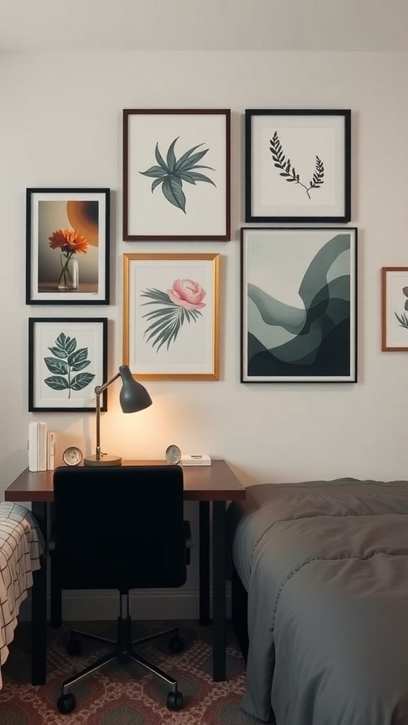 Wall art can transform a simple dorm room into a stylish retreat. In this image, a collection of framed artworks creates a stunning focal point. Each piece adds character and personality, making the space feel more inviting.