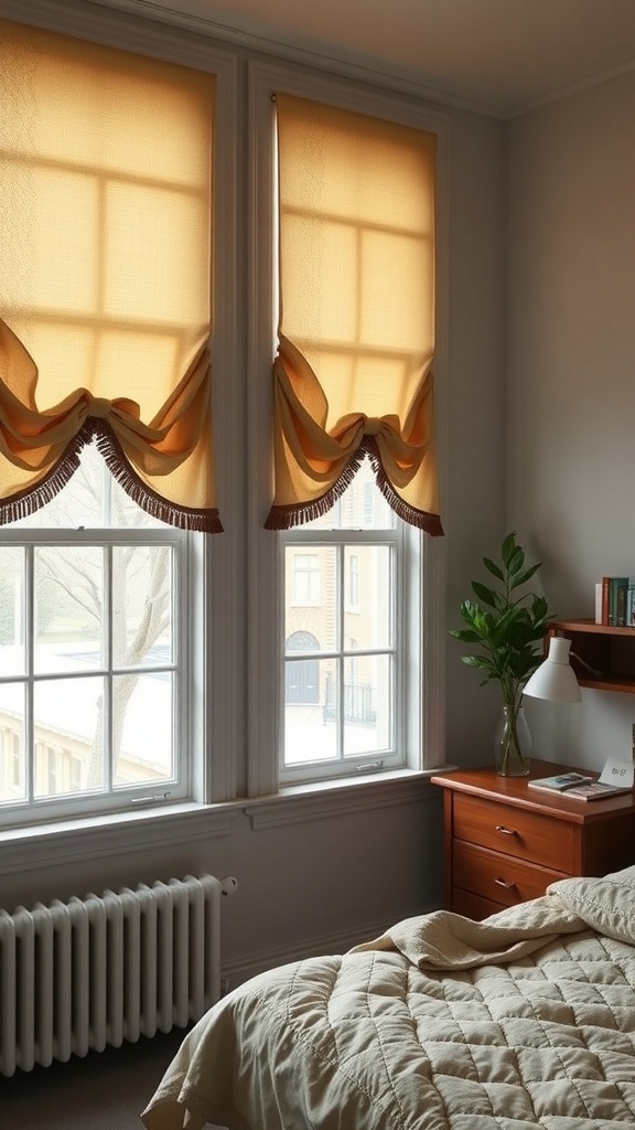 When it comes to creating a stylish dorm room, window treatments can make a big difference. The image shows a cozy space featuring elegant window coverings that add a touch of sophistication. The soft, warm tones of the fabric complement the overall decor, making the room feel inviting.