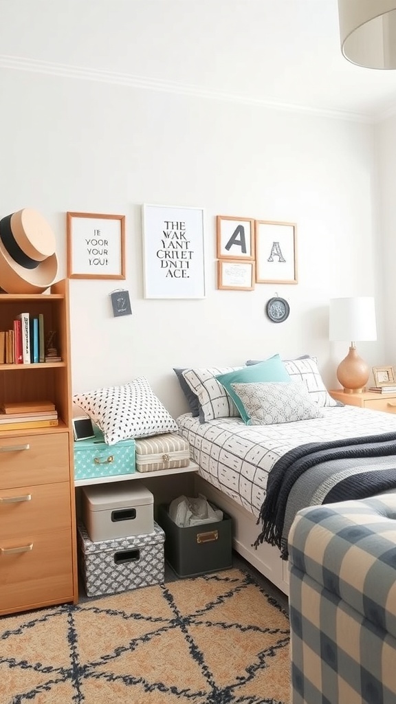 The wall art adds a personal touch, creating a space that feels inviting and uniquely yours. With thoughtful storage solutions, you can make the most of your dorm room while keeping it chic and organized.