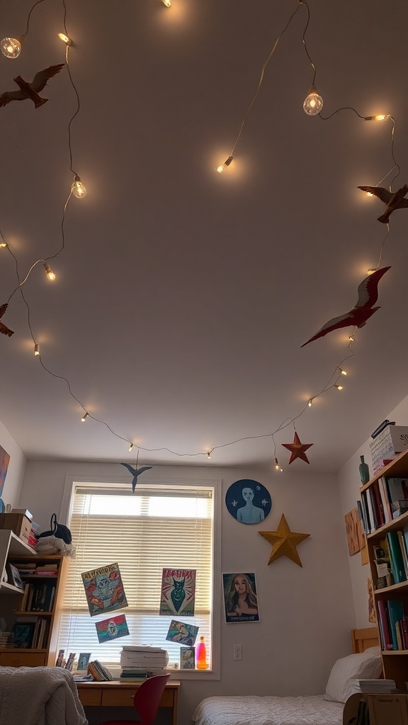 Ceiling decor can truly transform a dorm room into a cozy retreat. In this image, we see a creative setup featuring string lights and paper birds that add a whimsical touch. The soft glow from the lights creates a warm atmosphere, perfect for late-night study sessions or relaxing with friends.