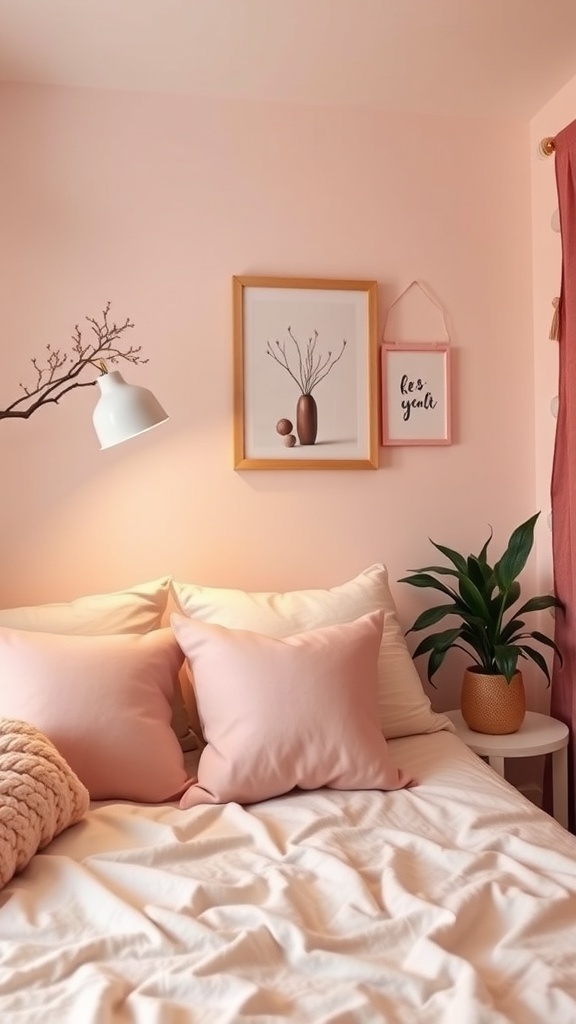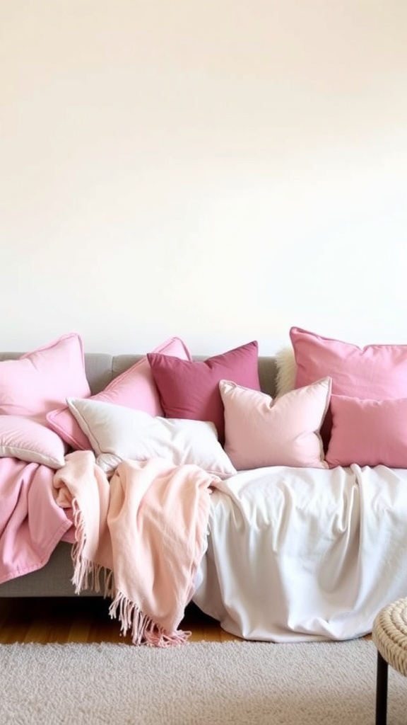 Mixing different textures and shades of pink can make your space feel more dynamic. The combination of light and dark pinks, along with a neutral blanket, provides a nice balance. This setup not only looks great but also invites relaxation, perfect for those late-night study sessions or movie marathons.