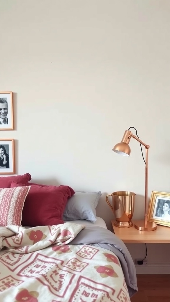 Rose gold accessories can add a touch of warmth and elegance to any dorm room. In the image, a stylish rose gold lamp stands beside a cozy bed, creating a chic vibe. The lamp’s sleek design complements the soft pillows and blankets, enhancing the overall aesthetic.