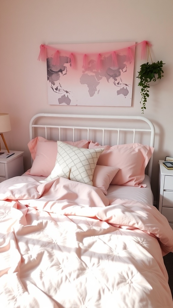 Adding decorative elements like a wall art piece with a world map and a touch of greenery from a hanging plant enhances the overall vibe. These details make the room feel more personalized and lively.