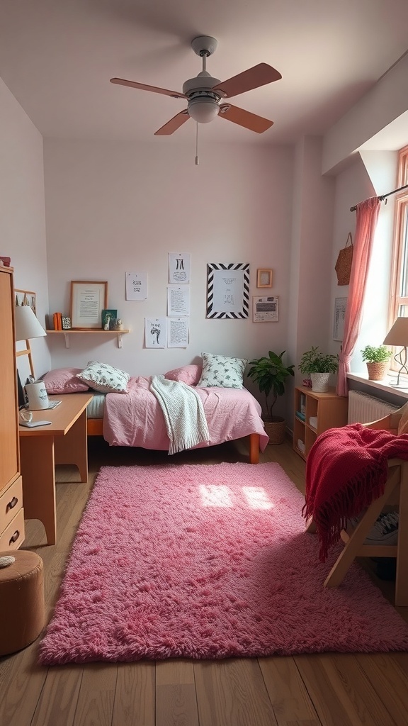Soft pink rugs can completely change the vibe of a dorm room. They add warmth and comfort, making the space feel cozy and inviting. In the image, the plush pink rug stands out beautifully against the wooden floor, creating a lovely contrast.