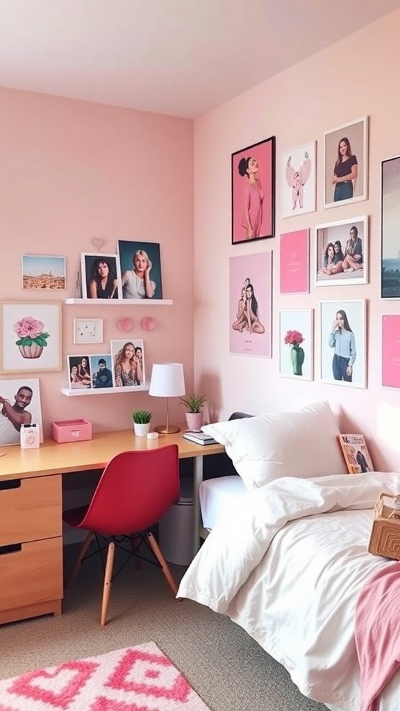 A pink gallery wall can truly transform your dorm room into a cozy and stylish space. This image showcases a lovely setup where various framed photos and art pieces create a vibrant focal point. The soft pink walls enhance the overall aesthetic, making it feel warm and inviting.