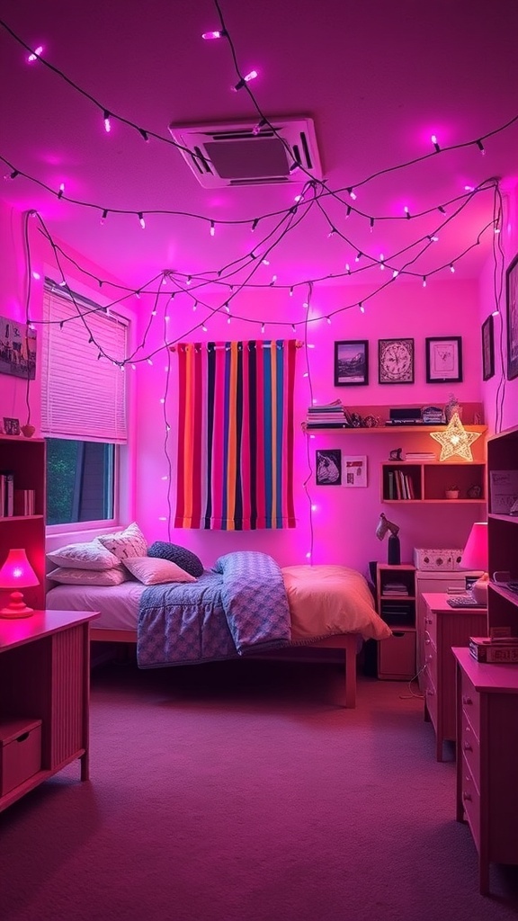 Pink string lights can transform any dorm room into a cozy retreat. The soft glow adds a playful touch, making the space feel inviting and warm. In the image, you can see how these lights drape across the ceiling, creating a whimsical atmosphere.