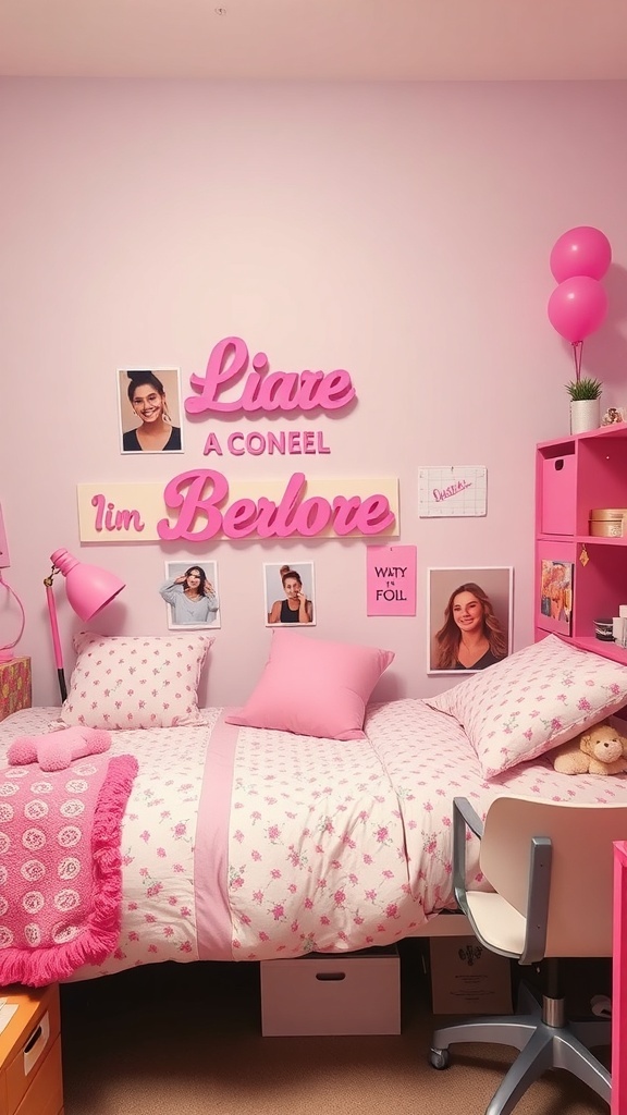 Above the bed, you can see a fun arrangement of photos and decorative letters. This not only showcases personal memories but also gives the room a unique character. The bright pink lamp and matching pillows tie everything together, making it feel cohesive and stylish.