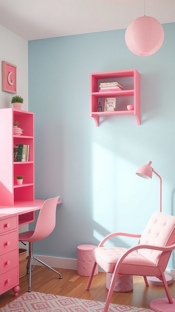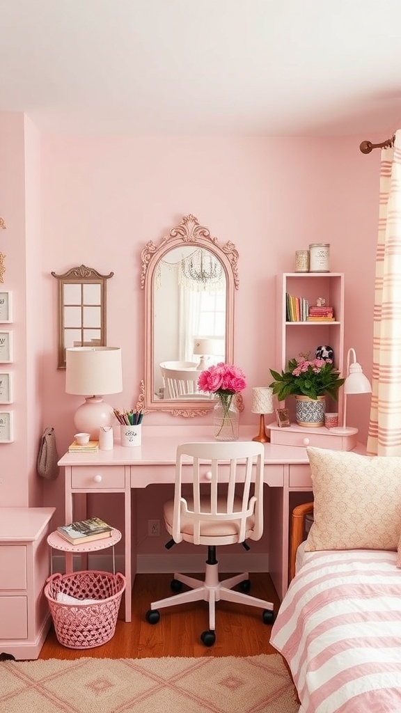 The desk area is a perfect blend of functionality and style. A pink desk paired with a cozy chair invites you to sit down and get to work. The decorative items, like the lamp and flowers, add personality and a pop of color. A cute basket for storage keeps things tidy while maintaining the aesthetic.