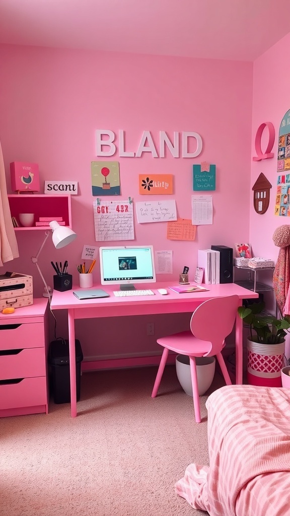 Creating a pink-themed desk area can bring a cheerful vibe to your dorm room. The image showcases a bright pink desk that stands out beautifully against the soft pink walls. This setup is perfect for anyone looking to add a pop of color to their study space.