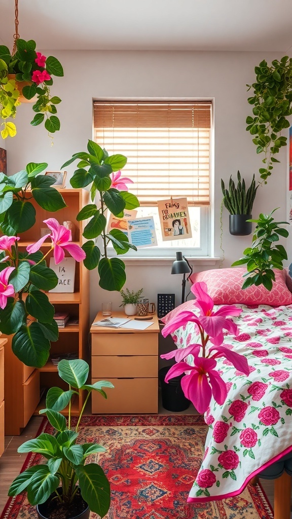 Incorporating plants into your pink dorm room can create a lively and inviting space. The vibrant pink flowers in the image add a cheerful touch, making the room feel fresh and bright.