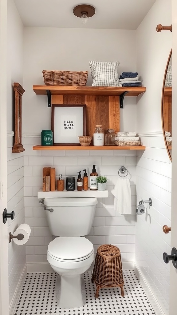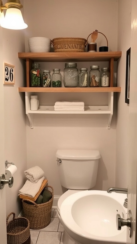 In addition to jars, the shelves provide extra space for towels and other essentials. This setup maximizes storage without overwhelming the small area. It’s a smart solution for anyone looking to keep their bathroom organized and stylish.