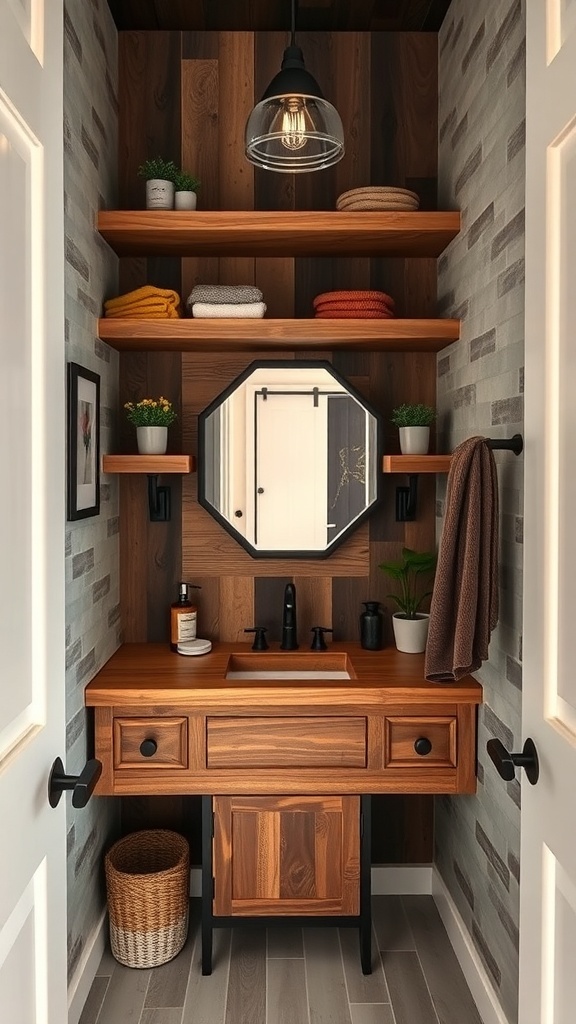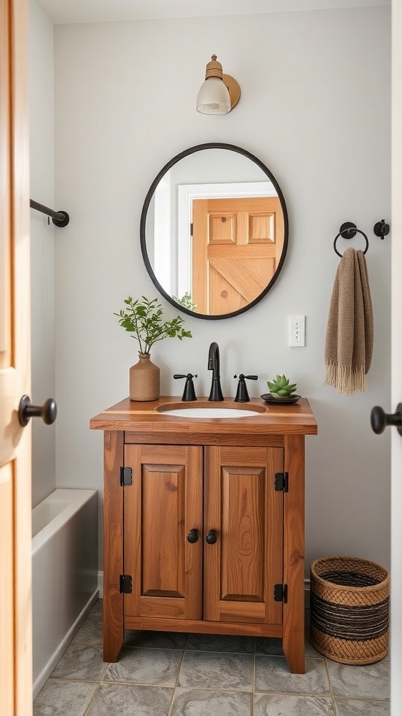 Wooden vanities bring a warm, inviting feel to small bathrooms. The image showcases a charming wooden vanity that fits perfectly in a rustic setting. Its rich, natural wood tones add character and warmth, making the space feel cozy.