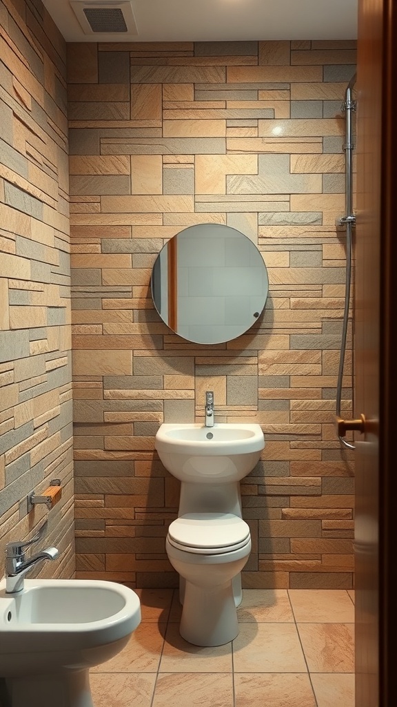 Natural stone tiles can bring a warm, earthy feel to your small bathroom. The image showcases a cozy space with beautifully arranged stone tiles on the walls. These tiles feature a blend of warm tones, creating a welcoming atmosphere.