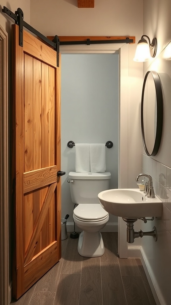 A barn door entry is a charming addition to any small bathroom, bringing a rustic touch that feels cozy and inviting. The image showcases a beautifully crafted wooden barn door that slides open, saving space and adding character.