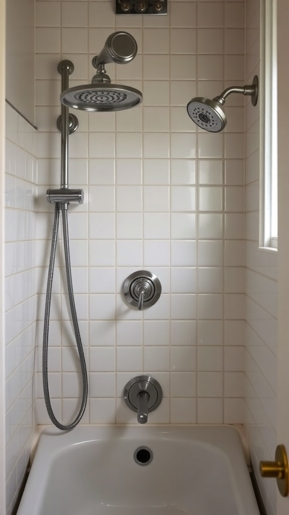 When it comes to rustic small bathrooms, vintage-style fixtures can make a huge difference. The image showcases a charming shower setup that perfectly embodies this theme. The combination of a handheld showerhead and a larger overhead fixture adds a touch of nostalgia while still being functional.