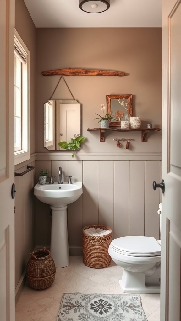The earthy color palette in this rustic small bathroom creates a warm and inviting atmosphere. Soft browns and muted greens blend seamlessly, making the space feel cozy and grounded. The walls are painted in a gentle beige, which complements the natural wood accents beautifully.